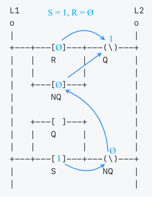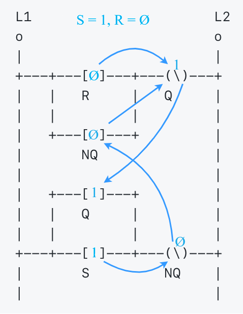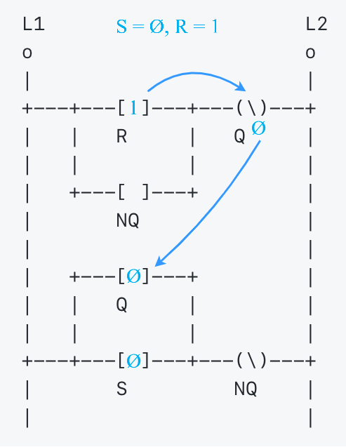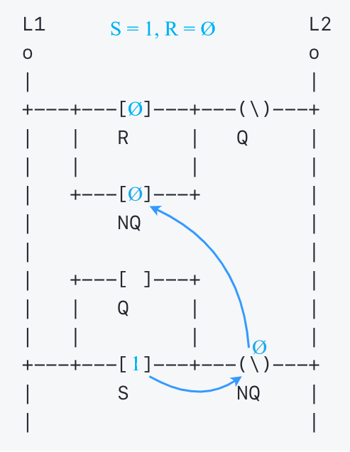 ```text L1 L2 o o | | +---+---[ ]---+---(\)---+ | | R | Q | | | | | | +---[ ]---+ | | NQ | | | | +---[ ]---+ | | | Q | | | | | | +---+---[ ]---+---(\)---+ | S NQ | | | ```