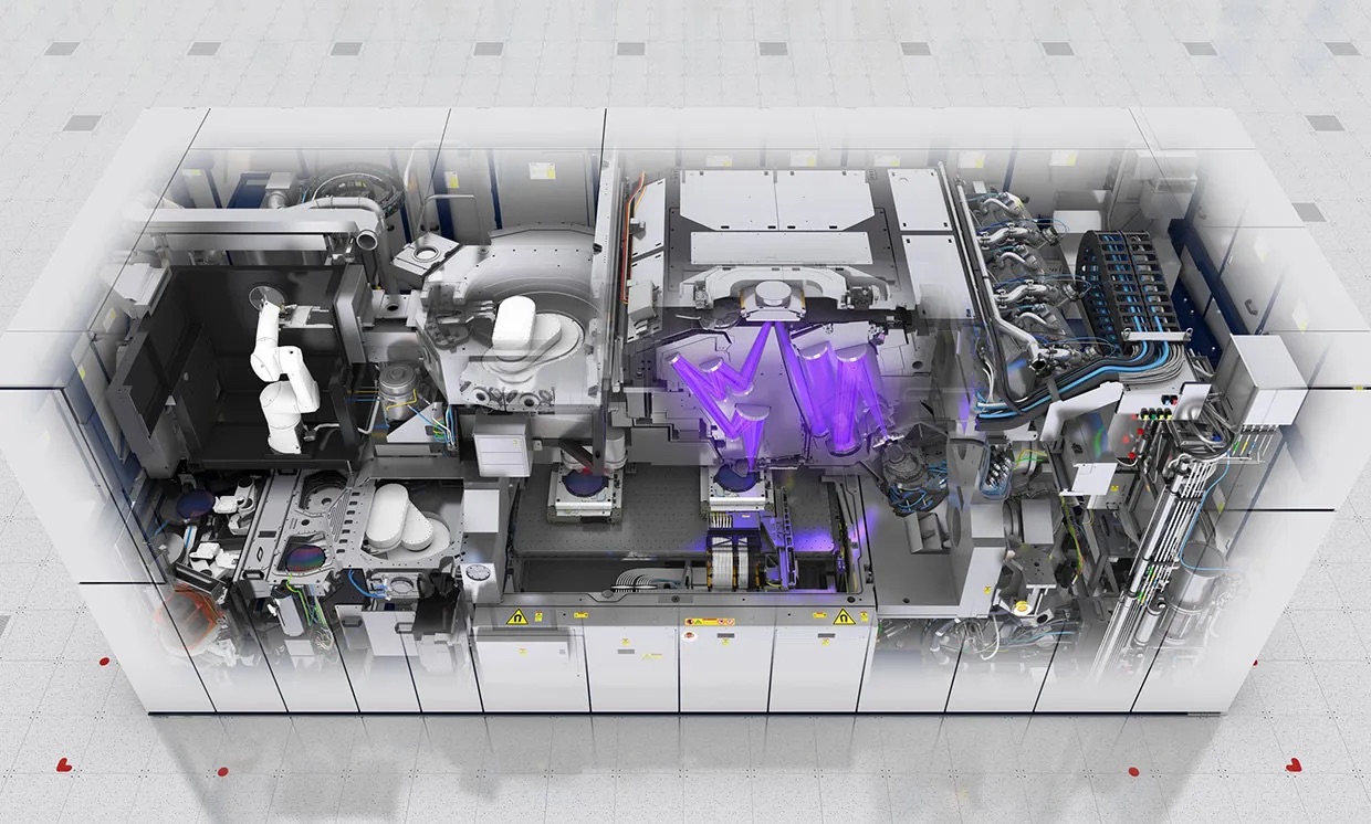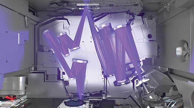 "Внутри самой современной EUV-машины каждую секунду 50 000 капель расплавленного олова падают через камеру в её основании. Пара высокоэнергетических лазеров на углекислом газе ударяет по каждой капле, создавая плазму, которая, в свою очередь, испускает свет нужной длины волны. Первый импульс преобразует каплю олова в туманную форму блина, так что второй импульс, который является более мощным и следует за ним всего через 3 микросекунды, взрывает олово в плазму, которая светится на длине волны 13,5 нанометров, как показано на [видео](https://www.youtube.com/watch?v=aR-4AH6n_w8&list=PLLROOWd6snSJjAHlf9YvdjSF7DGxMDJsD&index=1&ab_channel=ASML)."