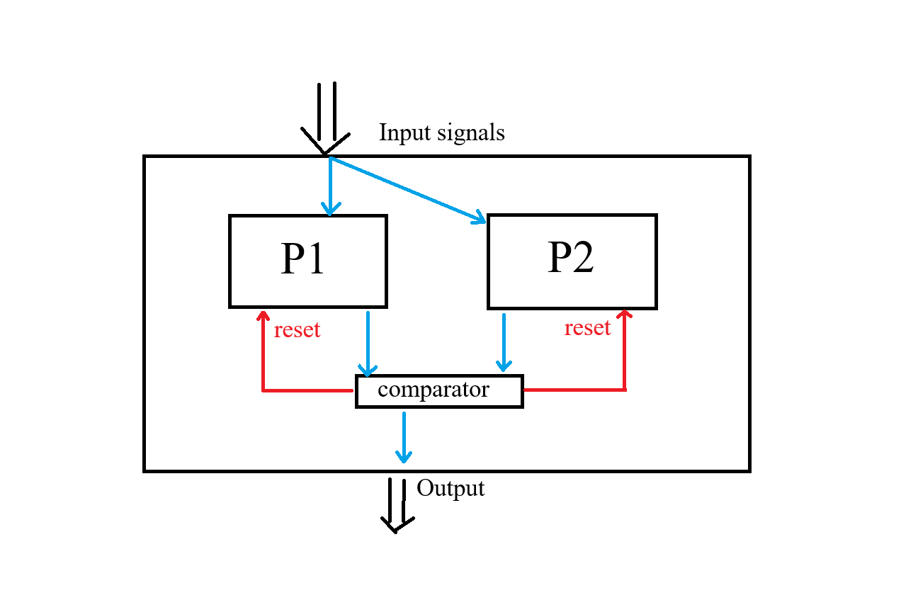 `comparator` — сравнивает результат работы `P1` и `P2` и, в случае ошибки, — аварийная перезагрузка.