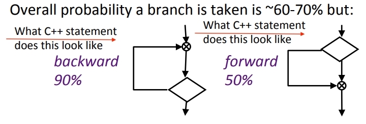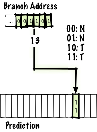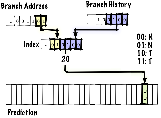 --- ### Branch Prediction #### Статические предсказания переходов Предсказание определяется инструкцией перехода.  1. Условный переход **вперёд** — не произойдёт. 1. Условный переход **назад** — произойдёт (циклы). 1. Некоторые процессоры (Pentium 4) поддерживают "подсказки компилятора" для предсказаний. ---- #### Динамические предсказания переходов Предсказание использует историю переходов программы.   Счётчик с накоплением, 2-bit  ---- ##### Многоуровневые предсказатели переходов