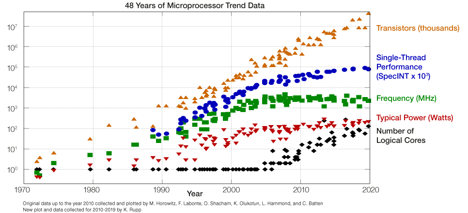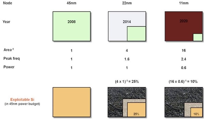 1. Дороговизна (физическая невозможность) дальнейшего уменьшения размера транзистора. 1. Токи утечки. 1. Power wall и Dark Silicon $\longrightarrow$