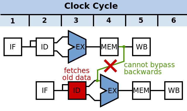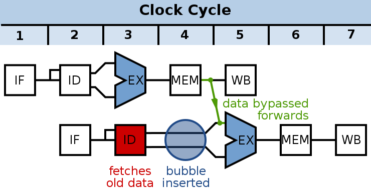 ---- ### RISC. Типовая организация  --- ### RISC. Проблемы конвейеризации (Всё ведь не может быть так хорошо?) - Структурные конфликты / Structural dependency - Конфликты по данным / Data Dependency / Data Hazard - Конфликты по управлению / Control Dependency / Branch Hazards ---- #### Структурные конфликты / Structural Dependency - Конфликт из-за ресурсов. Аппаратура не позволяет выполнить все возможные комбинации инструкций. - Пример: одновременный доступ к единой памяти команд/данных. ```text | Tick | 1 | 2 | 3 | 4 | 5 | | Instr. | | | | | | |---------|------|------|------|-------|-------| | I1 | *IF* | ID | EX | *Mem* | WB | | I2 | | *IF* | ID | EX | *Mem* | | I3 | | | *IF* | ID | EX | | I4 | | | | *IF* | ID | | I5 | | | | ^ | *IF* | | ^ | | Write Back Conflict ---+ | Memory Access | Execution | Instruction Decode | Instruction Fetch ``` - Варианты полного решения проблемы: - Гарвардская архитектура. - Двухпортовая память. ---- #### Разрешение конфликта пузырьком ```text | Tick | 1 | 2 | 3 | 4 | 5 | 6 | 7 | 8 | 9 | | Instr. | | | | | | | | | | |---------|------|------|------|-------|-------|-------|---------|----|----| | I1 | *IF* | ID | EX | *Mem* | WB | | | | | | I2 | | *IF* | ID | EX | *Mem* | WB | | | | | I3 | | | *IF* | ID | EX | *Mem* | WB | | | | - | | | | 0 | 0 | 0 | 0 | 0 | | | - | | | | ^ | 0 | 0 | 0 | 0 | 0 | | - | | | | | | ^ | 0 | 0 | 0 | 0 | | I4 | | | | | | | | ^ | *IF* | ID | EX | | | | | | | push bubbles ---+-------+-------+ ``` - `0` — пузырёк: - занимает конвейер; - не выполняет никаких действий; - просто в реализации; - снижение эффективности. --- #### Конфликты по данным (Hazards)