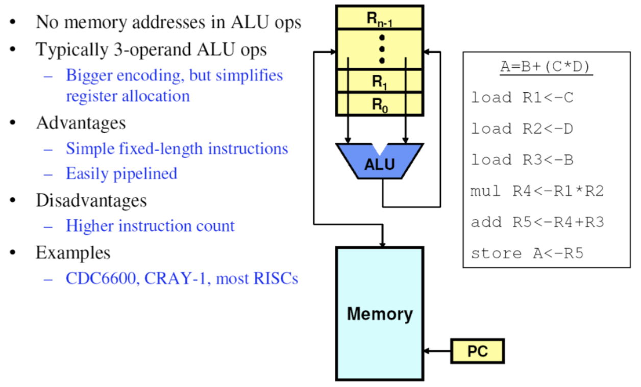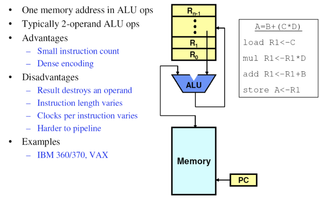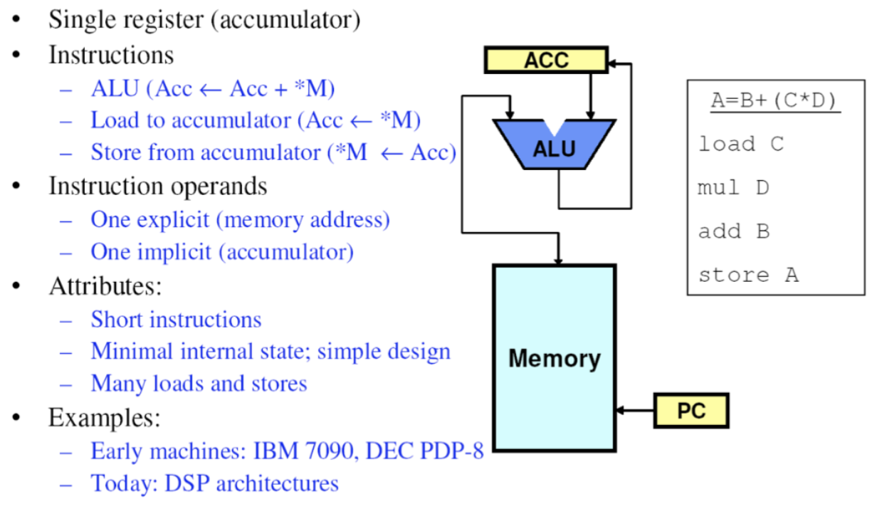 **Краткая выжимка**: ```asm ;;;; Acc load ACC <- A ; acc mul ACC <-* B ; 1 operands add ACC <-+ C store Y <- ACC ``` ```asm ;;;; CISC mul R1 <- A * B ; reg-to-mem add Y <- R1 + C ; 2 operands ;; or mul D <- A * B ; mem-to-mem add Y <- D + C ; 2 operands ``` ```asm ;;;; RISC load R1 <- A ; reg-to-reg load R2 <- X ; 2 operands load R3 <- B mul R4 <- R1 * R2 add R5 <- R4 + R3 store Y <- R5 ``` ```forth \\\\ Stack A @ B @ * \ stack, 0 operands C @ + Y ! \ @ - read, ! - write ```