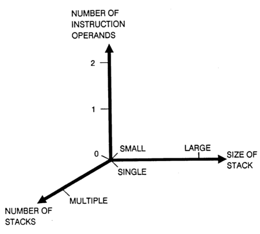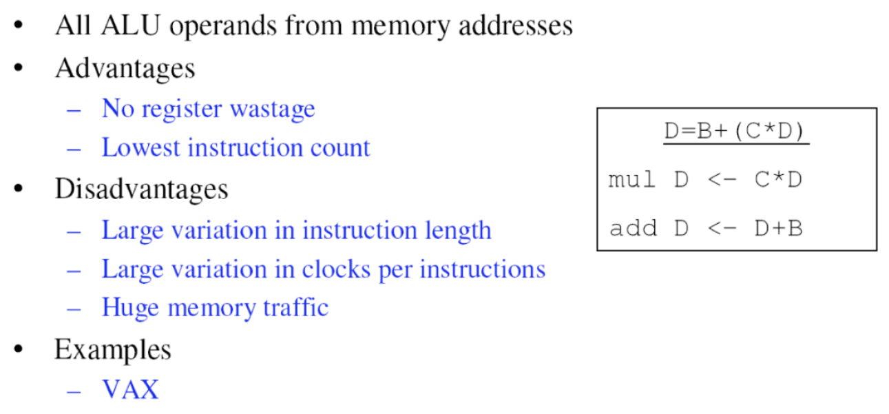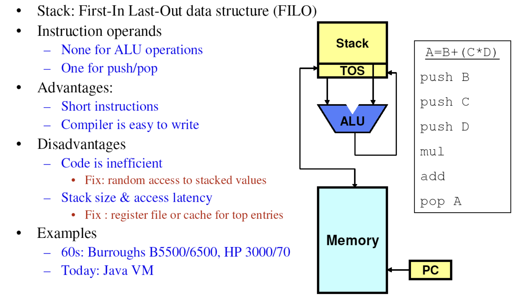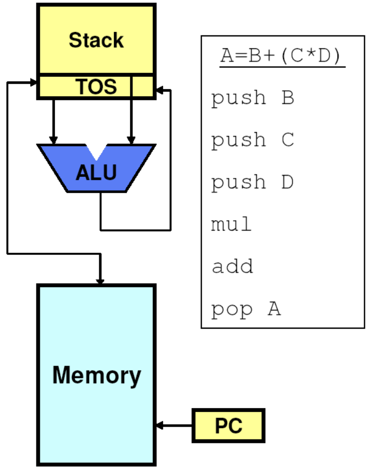 **Краткая выжимка**: ```asm ;;;; Acc load ACC <- A ; acc mul ACC <-* B ; 1 operands add ACC <-+ C store Y <- ACC ``` ```asm ;;;; CISC mul R1 <- A * B ; reg-to-mem add Y <- R1 + C ; 2 operands ;; or mul D <- A * B ; mem-to-mem add Y <- D + C ; 2 operands ``` ```asm ;;;; RISC load R1 <- A ; reg-to-reg load R2 <- X ; 2 operands load R3 <- B mul R4 <- R1 * R2 add R5 <- R4 + R3 store Y <- R5 ``` ```forth \\\\ Stack A @ B @ * \ stack, 0 operands C @ + Y ! \ @ - read, ! - write ```