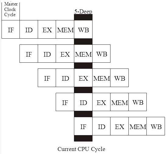 1. **Instruction Fetch**. Чтение инструкции по счётчику команд. 2. **Instruction Decode**. Декодировать инструкцию и считать регистры. 3. **Instruction Execute**. Операций изменения данных. 4. **Memory Access**. Чтение/запись операндов из памяти/в память. 5. **Write Back**. Запись результата в регистры.